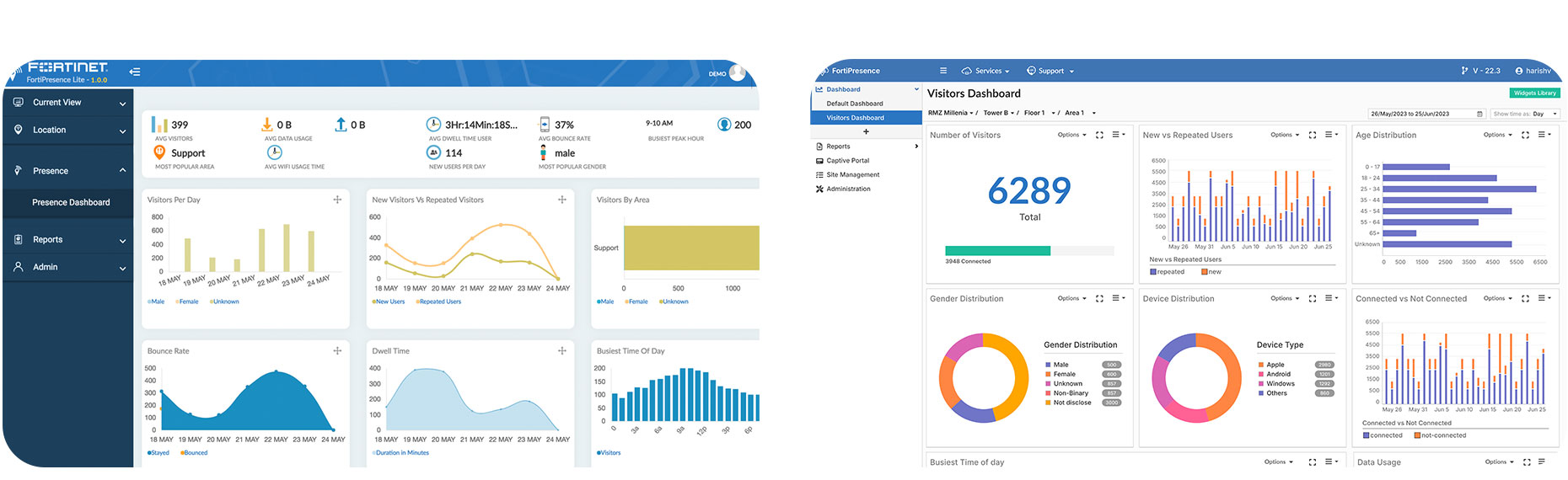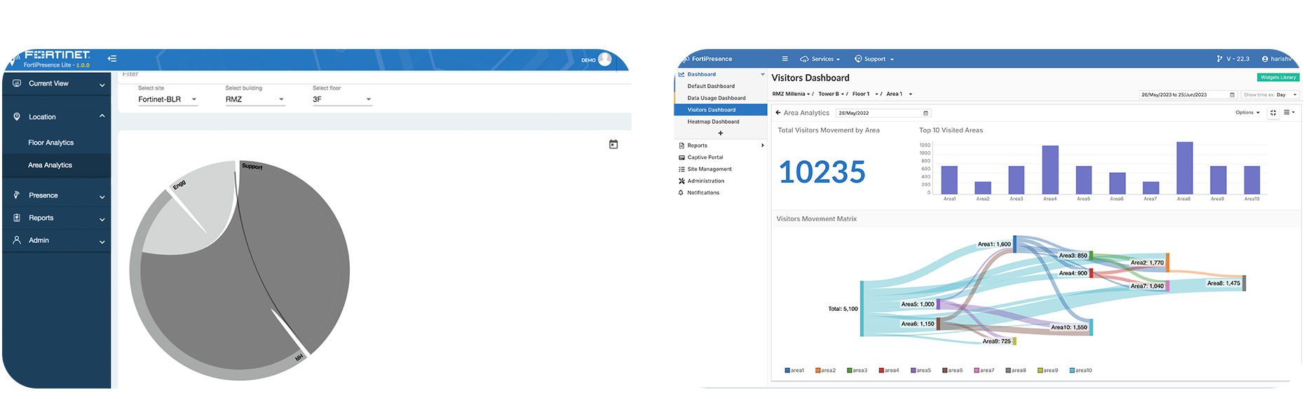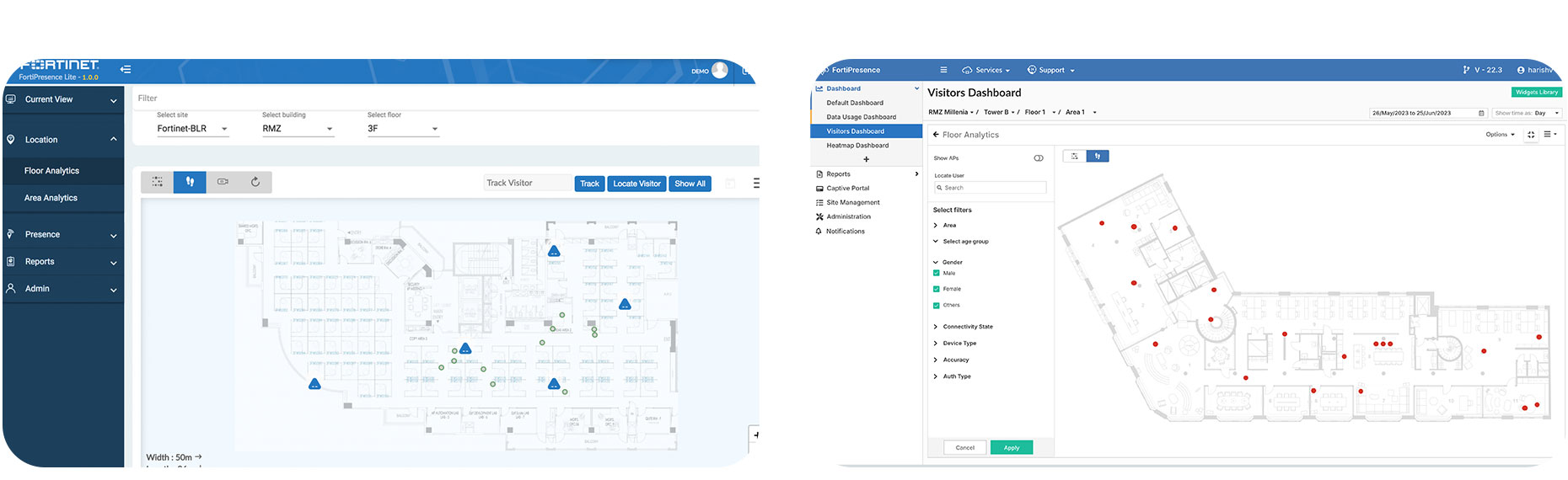 This visual set demonstrates the end-to-end dashboard experience in FortiPresence, showcasing how IT and business users monitor real-time visitor data, customize dashboards, and visualize location heatmaps. The journey blends insight discovery with physical presence mapping.