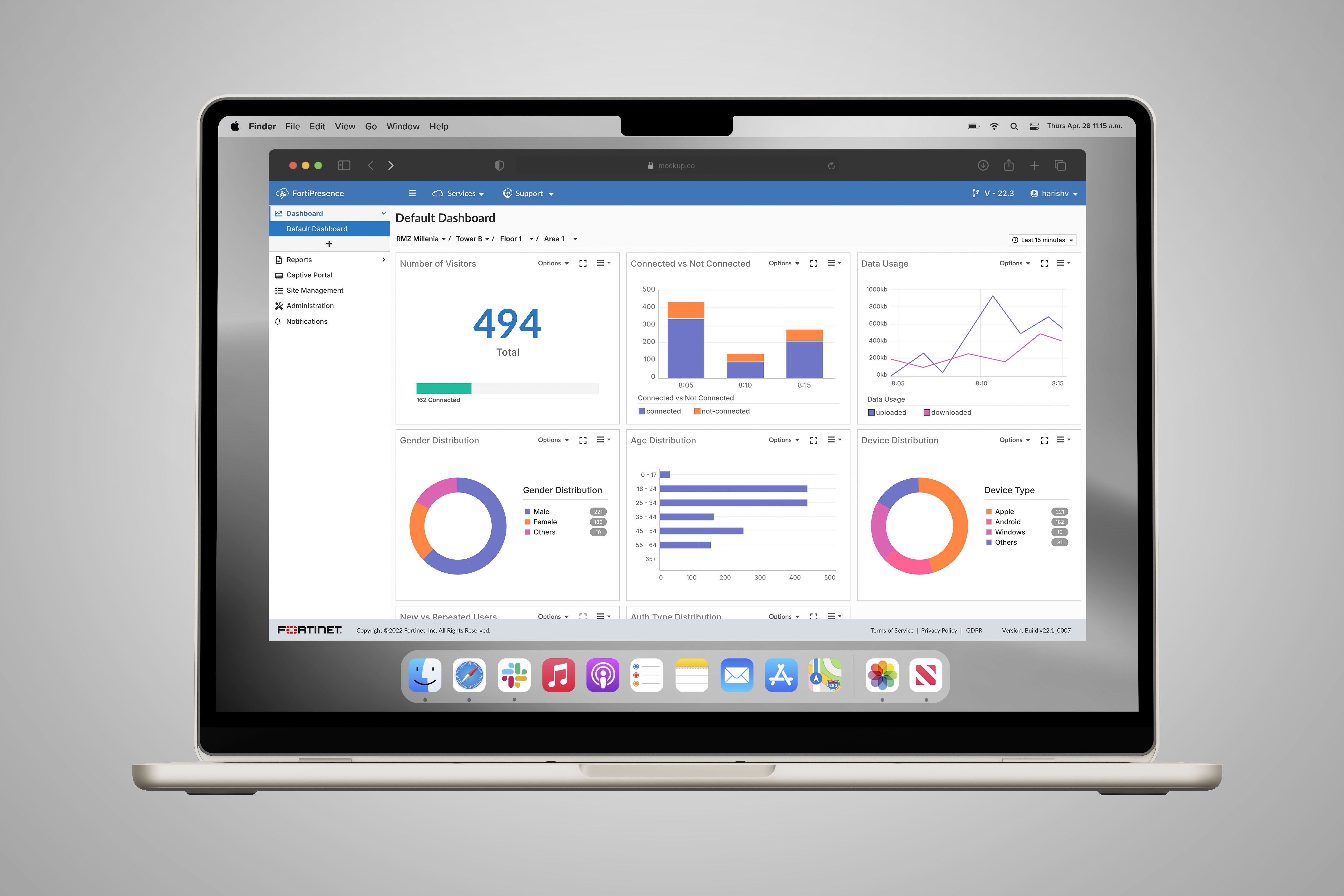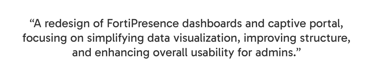 FortiPresence is an enterprise platform that provides visitor analytics and captive portal management. Over time, its dashboards, floor analytics, area analytics, and heatmaps became cluttered, inconsistent, and difficult to interpret, reducing admin efficiency. The redesign aimed to deliver a modern experience that would simplify dashboards, streamline setup flows, and provide deeper, actionable insights for enterprise admins.